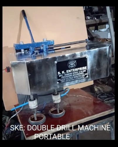 Ske-ddrilmc-portable type glass double drill machine for 3-12 mm glass double holes with one fix drill and another movable drill with special order and costumize type machine can be manufacturing manually operating with using water from inside drill shaft comming and drill 5 mm to 50mm also can be possible in this types machine. We can make semiautomatic with multy